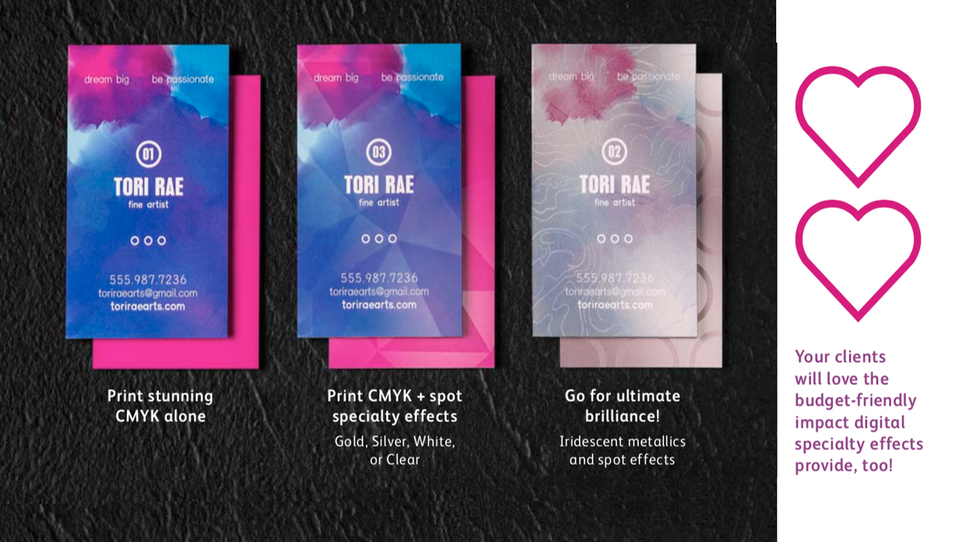 Le opportunità per creare un impatto mozzafiato sono illimitate, grazie alla bellissima resa dei colori CMYK unita alle meravigliose applicazioni con inchiostri secchi metallici ORO, ARGENTO, e tante altre ancora con il BIANCO e il TRASPARENTE LUCIDO.